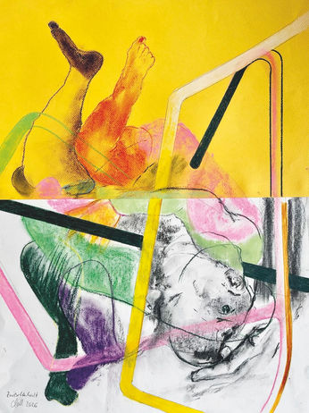 Die Zeichnungen der beiden Triptychen Zwischenhalt auf jeweils zweifarbigen Papierbögen verstehen Care als gesellschaftliche wie individuelle Erfahrung. Schon die Gespaltenheit des Hintergrunds symbolisiert eine Grundspannung zwischen den Polen Geben und Nehmen, Selbstaufgabe und Selbstverwirklichung, Hingabe und Abgrenzung, Objekt sein und Subjekt sein. Eine Hand an einem Körperteil kann Sinnbild sein für Halt geben oder für Distanz schaffen, Anziehung und Abstoßung. Korsettstangen geben Sicherheit, aber schränken Freiheit und Selbstentfaltung ein. Ausgehend vom Hin und Her der wechselnden Urzustände zwischen der symbiotischen Selbstauflösung und der Verteidigung des Selbst entstehen ambivalente Bildräume des Dazwischen: zwischen Nähe und Distanz, Erholung und Erschöpfung, Halten und Entgleiten. Im Medium Pastell wird diese Fragilität unmittelbar erfahrbar. Die kreidige Substanz bleibt offen, nicht fixiert, reagiert auf jede Berührung. Schichten überlagern sich, Linien verwischen, Formen bleiben vorläufig. Zeichnen wird so selbst zur Care-Praxis – ein permanentes Aushandeln von Stabilität und Verflüchtigung, Grenzziehung und Linienöffnung, Gewinn und Verlust. Und vielleicht ist Care genau das: etwas, das schwingend trägt, im Tragen immer wieder ins Wanken gerät. „Fest halten“ in seiner dichotomischen Doppelbedeutung von Gefängnis und Geborgenheit: Zwischenhalt. Ich selbst erlebe diese inneren Konfliktlinien im privaten Familienverbund, in den Frames